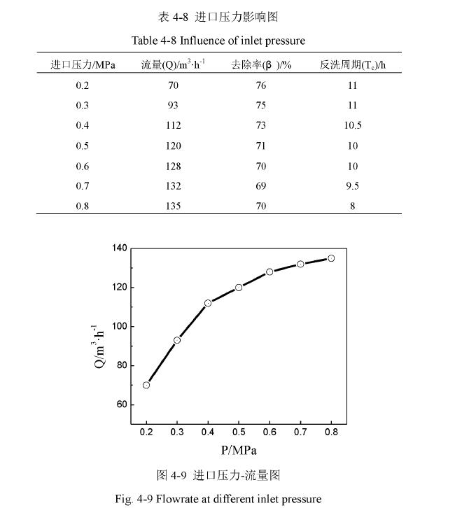 從圖可以看出,隨著壓力的,流量也不斷上升,當(dāng)進(jìn)口壓力的時候流量達(dá)到設(shè)計要求·,當(dāng)壓力超過以后,流量隨壓力上升開始變得緩慢。反洗的指示標(biāo)準(zhǔn)是當(dāng)出口壓力較初始運行時的出口壓力(由于進(jìn)口壓力不同,出水壓力也不相同)差小于時進(jìn)行人工反洗。從經(jīng)驗得出當(dāng)出口壓力下降以后,流量開始較大幅度降低,為確保處理流量在此時進(jìn)行反洗比較恰當(dāng)。