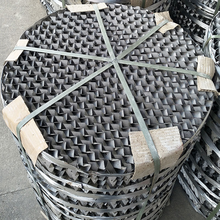 防辟流圈一般與填料一體每塊填料安裝前務(wù)必將防壁流恩按前述要求打開(kāi)。通常安安由一端開(kāi)始至另一端結(jié)束第()一盤(pán)填料波紋片方向與支承板方向成45角,相鄰兩盤(pán)填米波紋成90角每盤(pán)填料安裝的起始位置,每四盤(pán)填料為一個(gè)周期,這樣成順時(shí)針(或逆時(shí)針)方向轉(zhuǎn)動(dòng)組裝填料盤(pán),這樣可以縮小填料上端面水平誤差。絲網(wǎng)填料每盤(pán)安裝完畢后再去掉句角。+